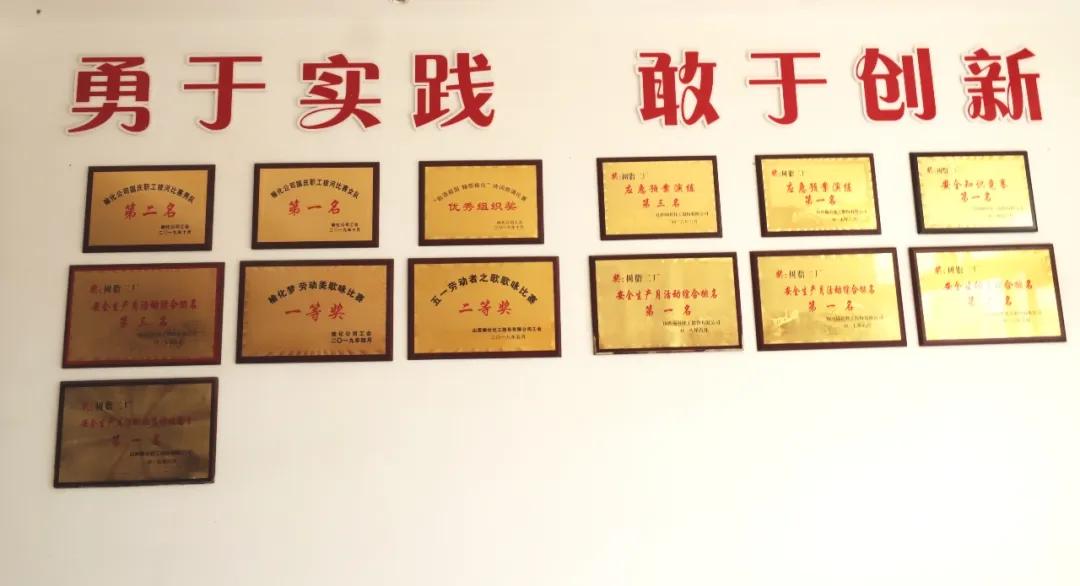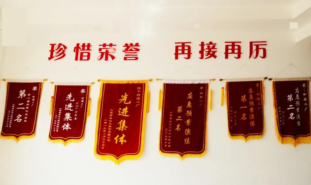 走進(jìn)樹脂二廠的辦公樓,映入眼簾的是一塵不染的樓梯與干凈的猶如鏡子的地面,但是最最吸引你眼球的一定是兩面墻上懸掛著的錦旗和釘在墻上的獎(jiǎng)狀。它們代表的是樹脂二廠的驕傲與榮譽(yù)。