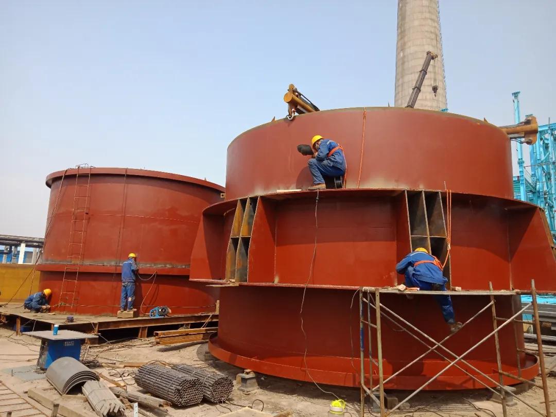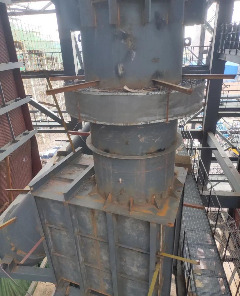 兩臺返料槽完成,兩臺旋風分離器抓釘正在焊接